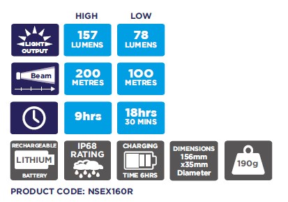 The EX-160R is an intrinsically safe, explosion proof rechargeable flashlight. It is made from high strength aluminium housing with a secure grip and offers a front torch light, along with a rear flood light.
